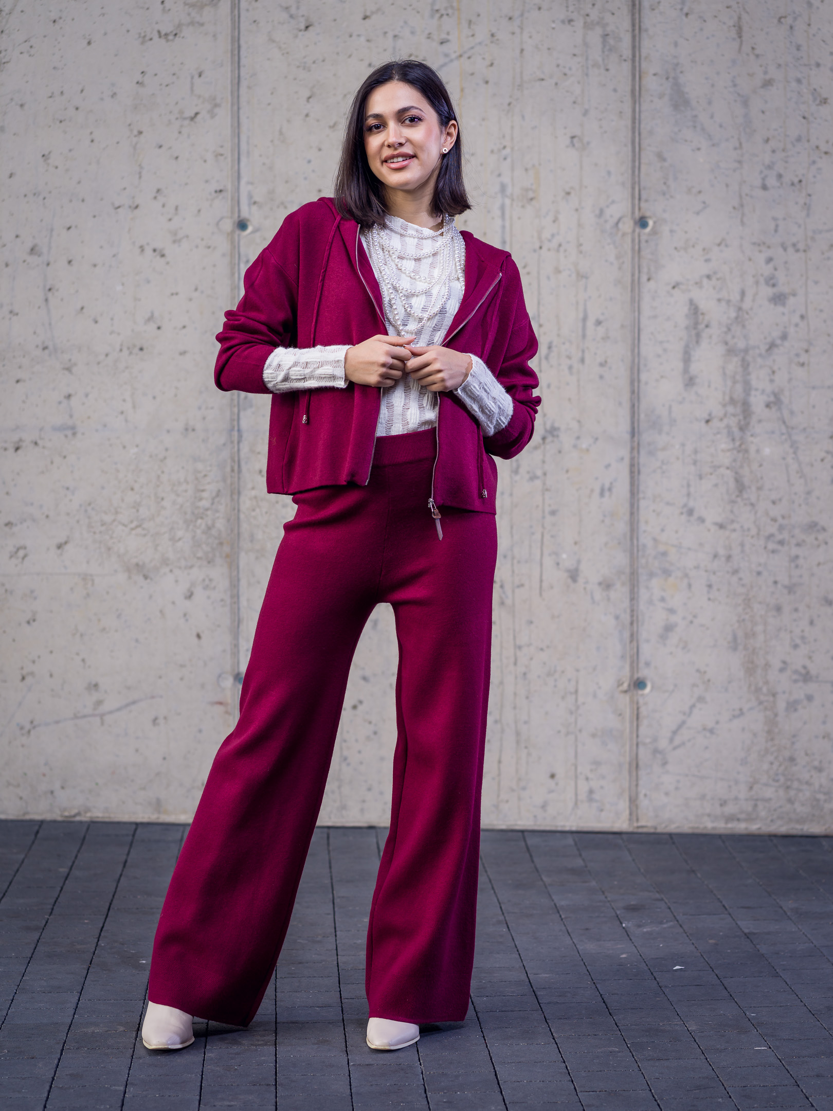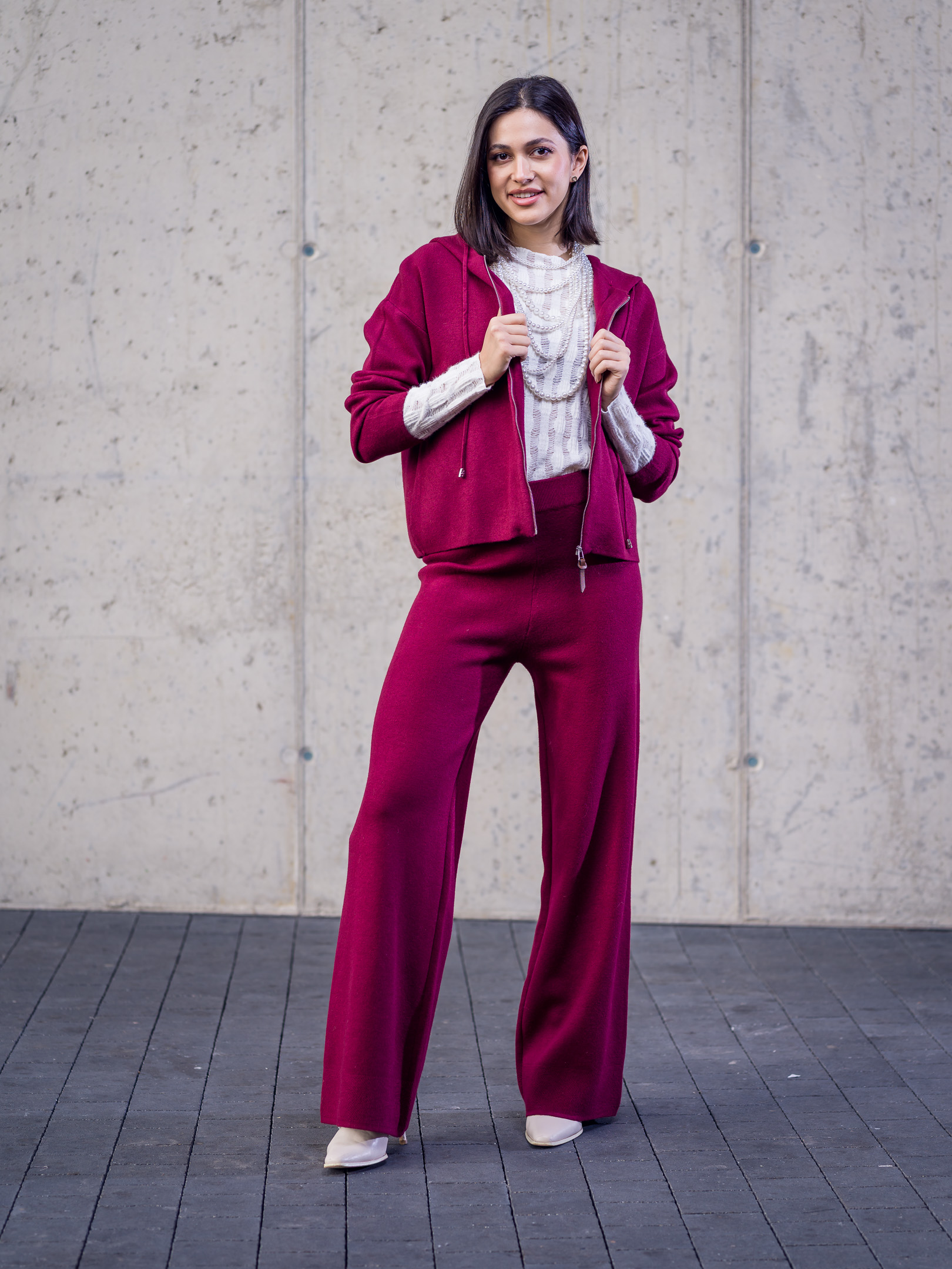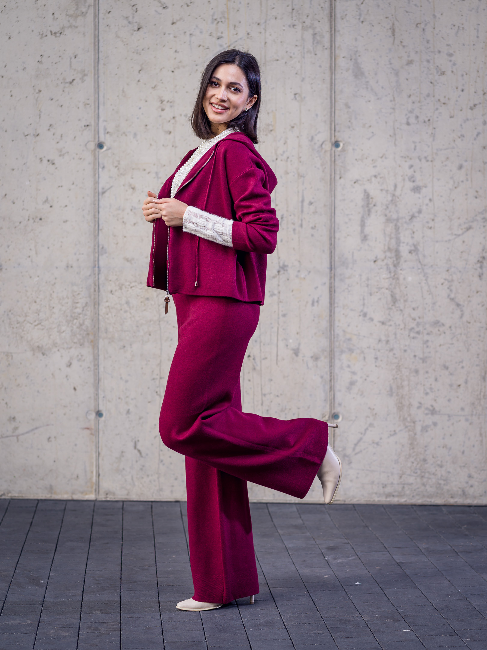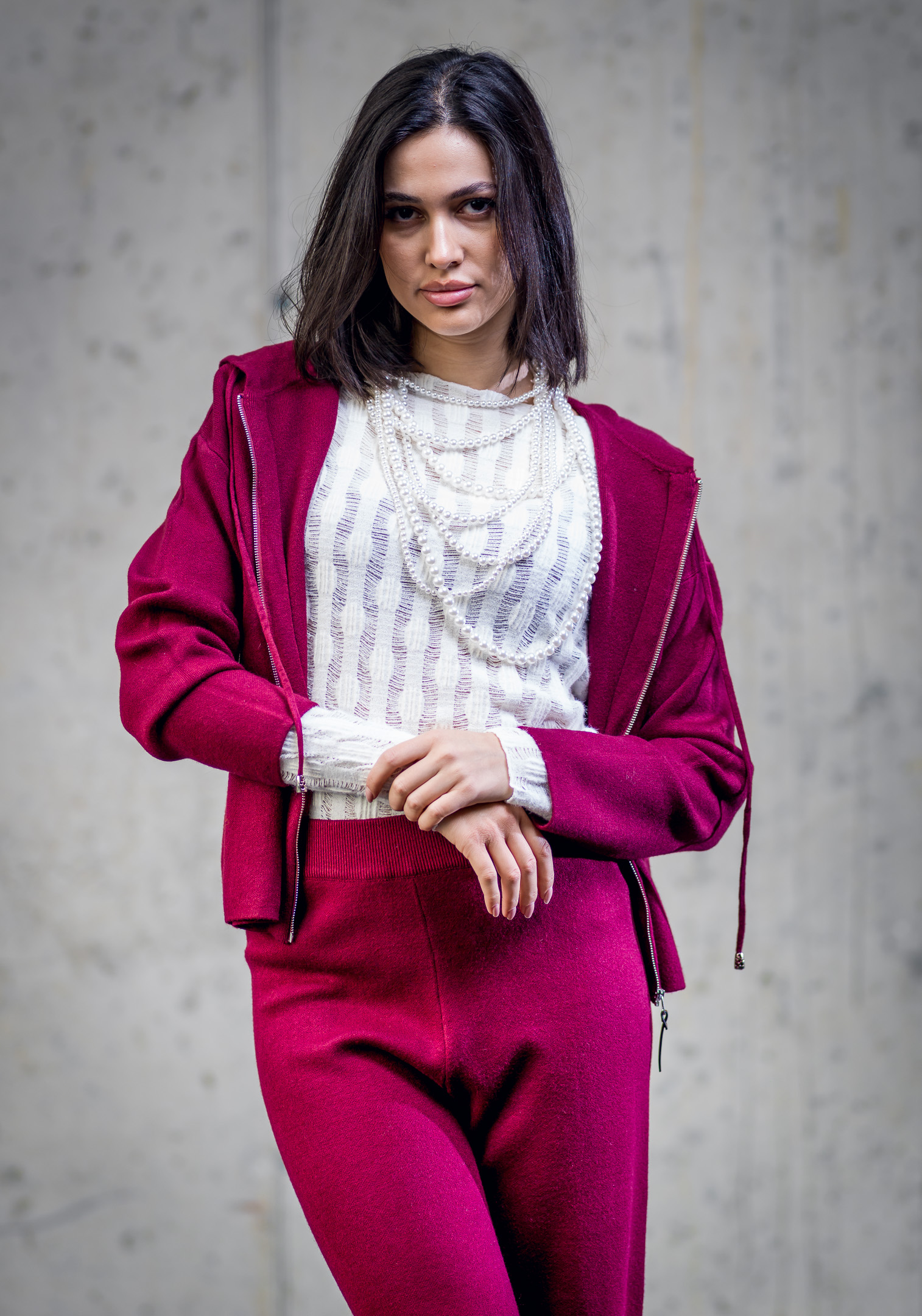 Krásny nohavicový komplet z mäkkého úpletu. Komplet sa skladá z nohavíc a pulóvrika na zips s kapucňou. Nohavice majú v páse gumičku, takže sa krásne prispôsobia postave.