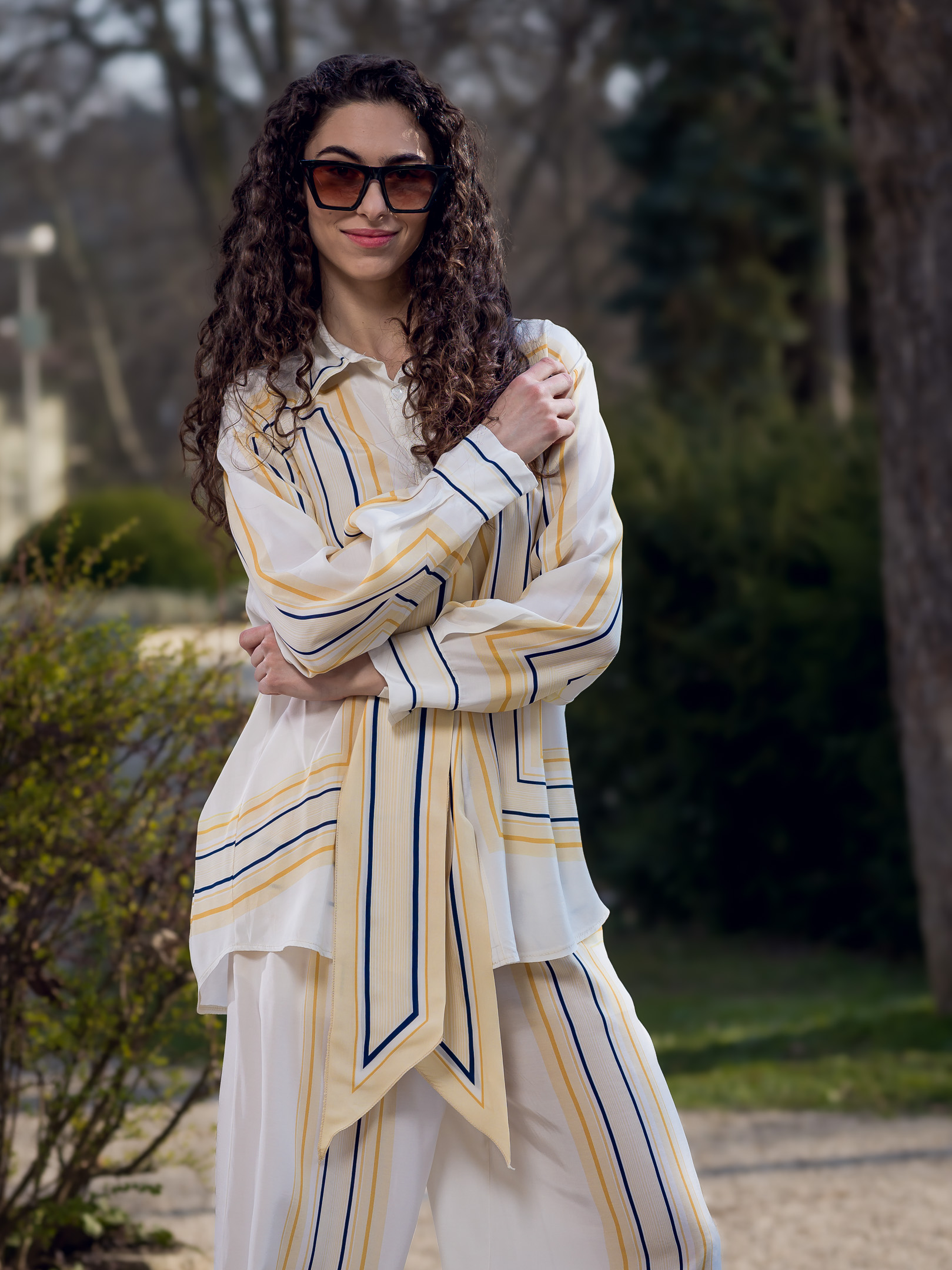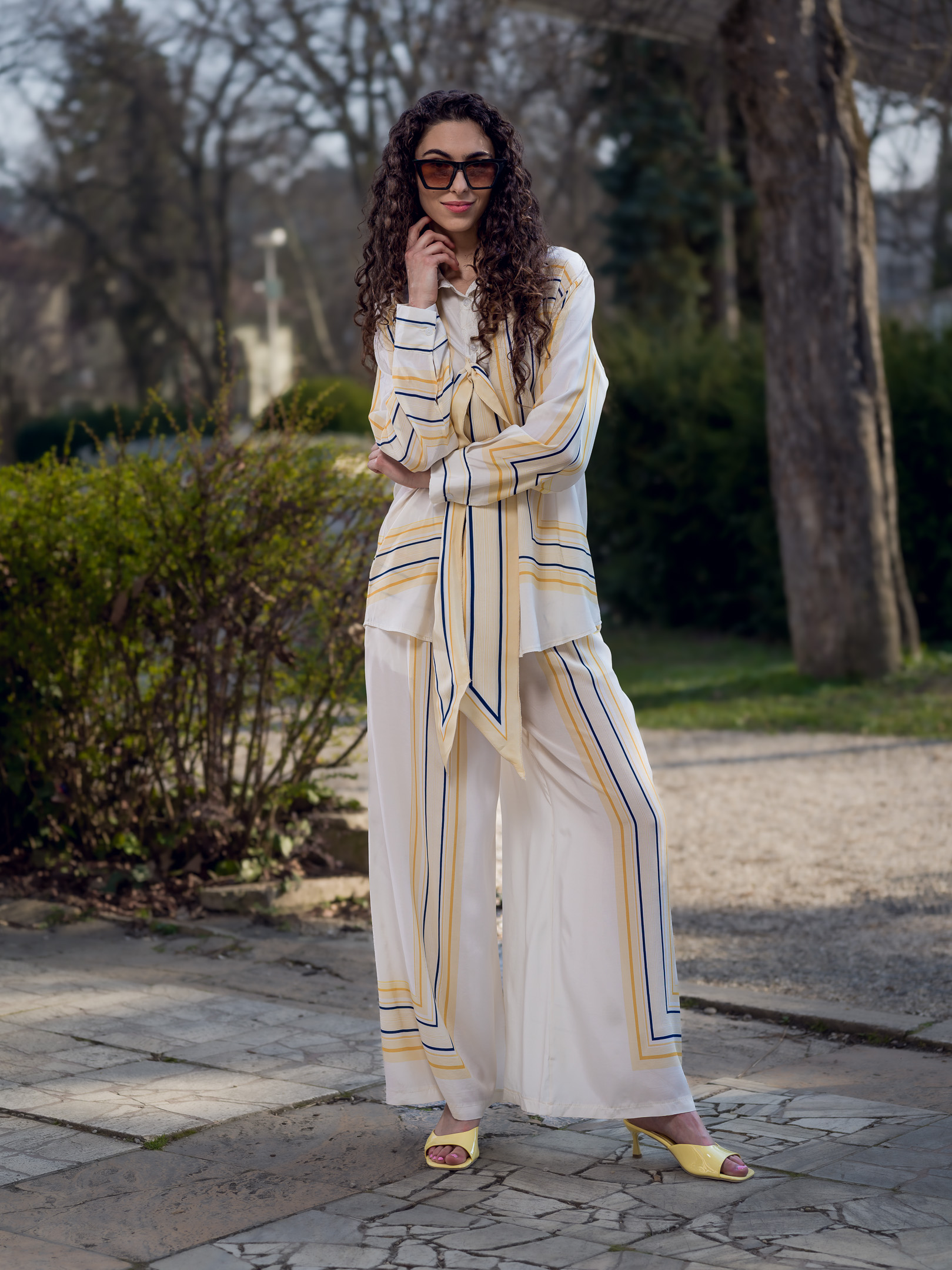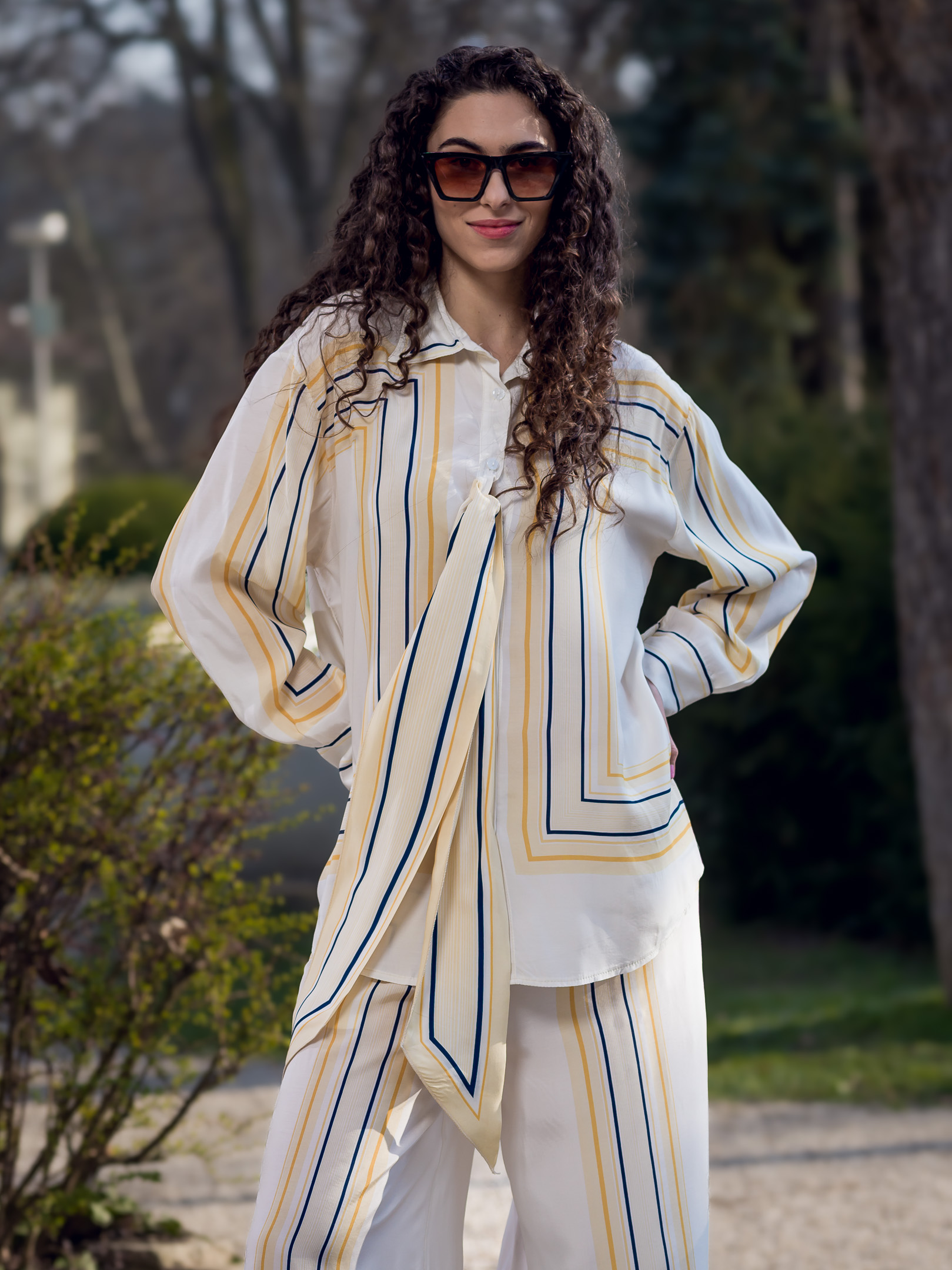 Krásny nohavicový komplet z padavého materiálu. Komplet sa skladá z nohavíc a blúzky.