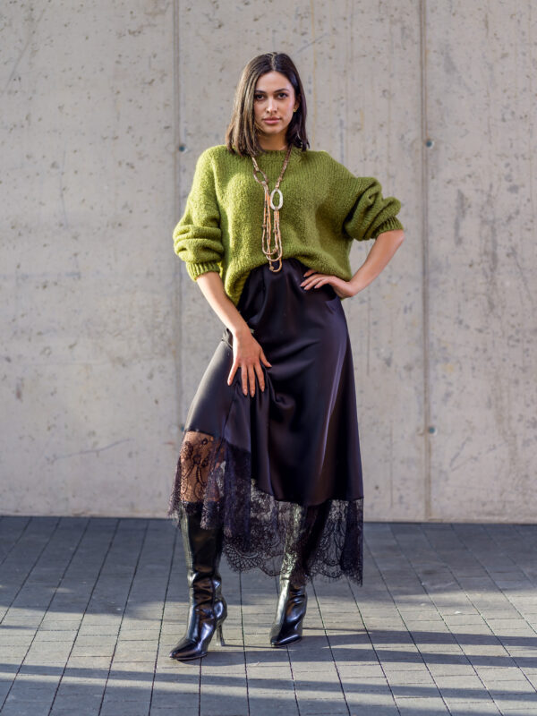 Trendy sukňa v midi dĺžke s elastickým pásom sa krásne prispôsobí postave. Sukňa m á po bokoch vrecká a všitý opasok na viazanie.
