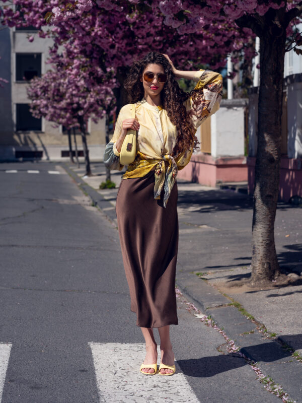 Trendy sukňa v midi dĺžke s elastickým pásom sa krásne prispôsobí postave. Sukňa m á po bokoch vrecká a všitý opasok na viazanie.
