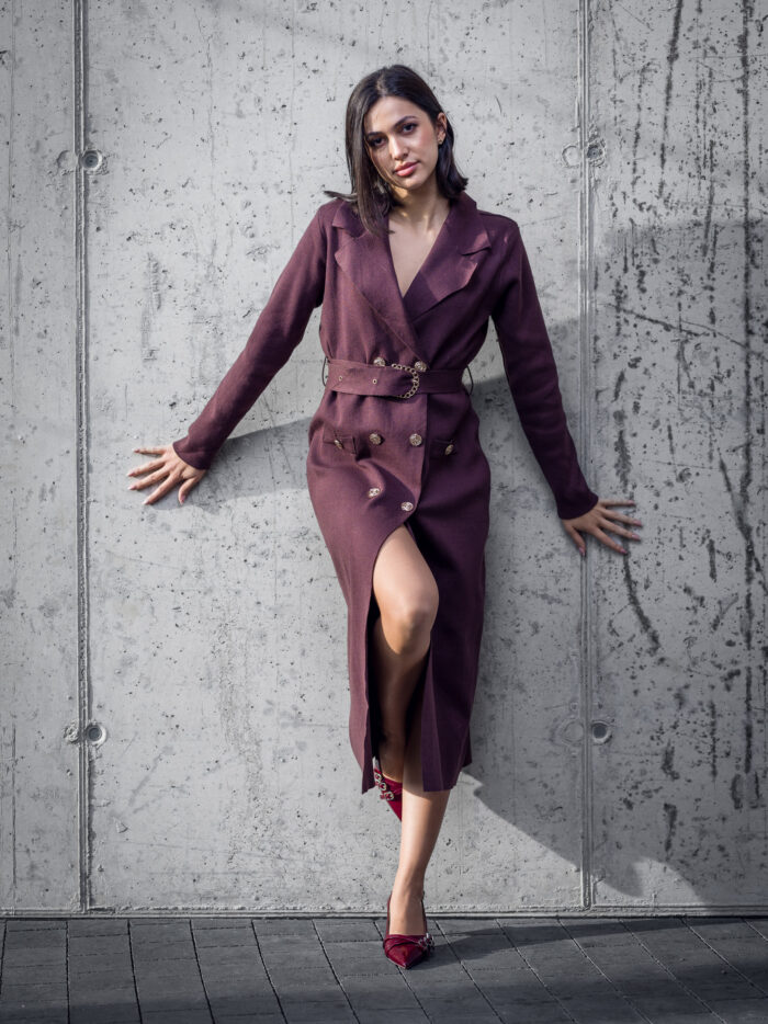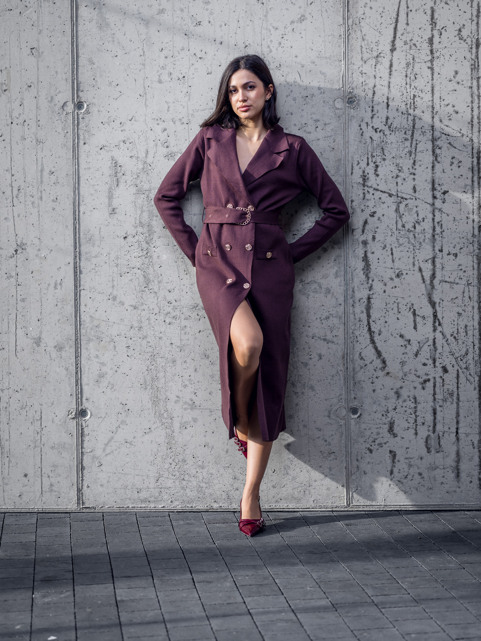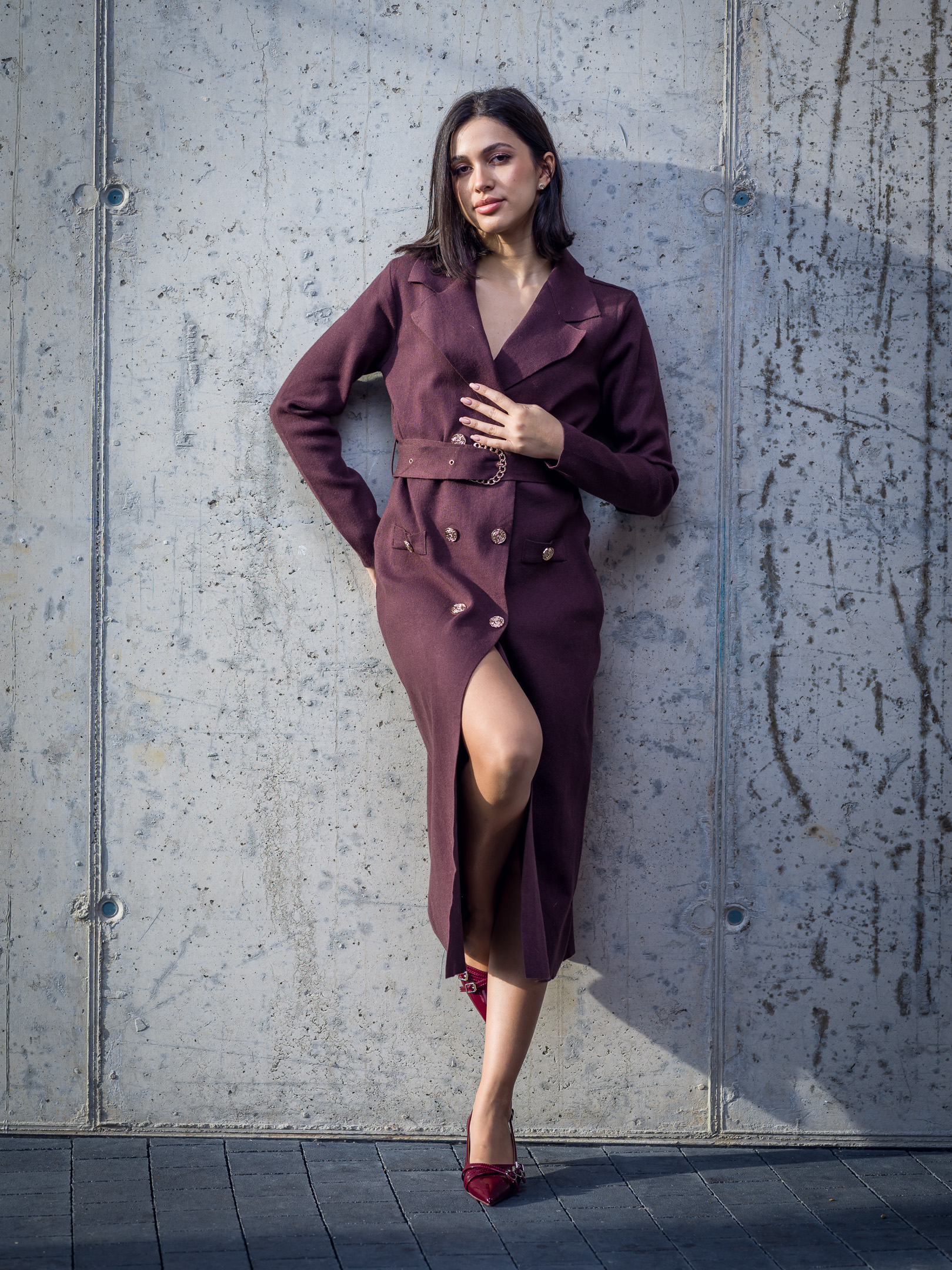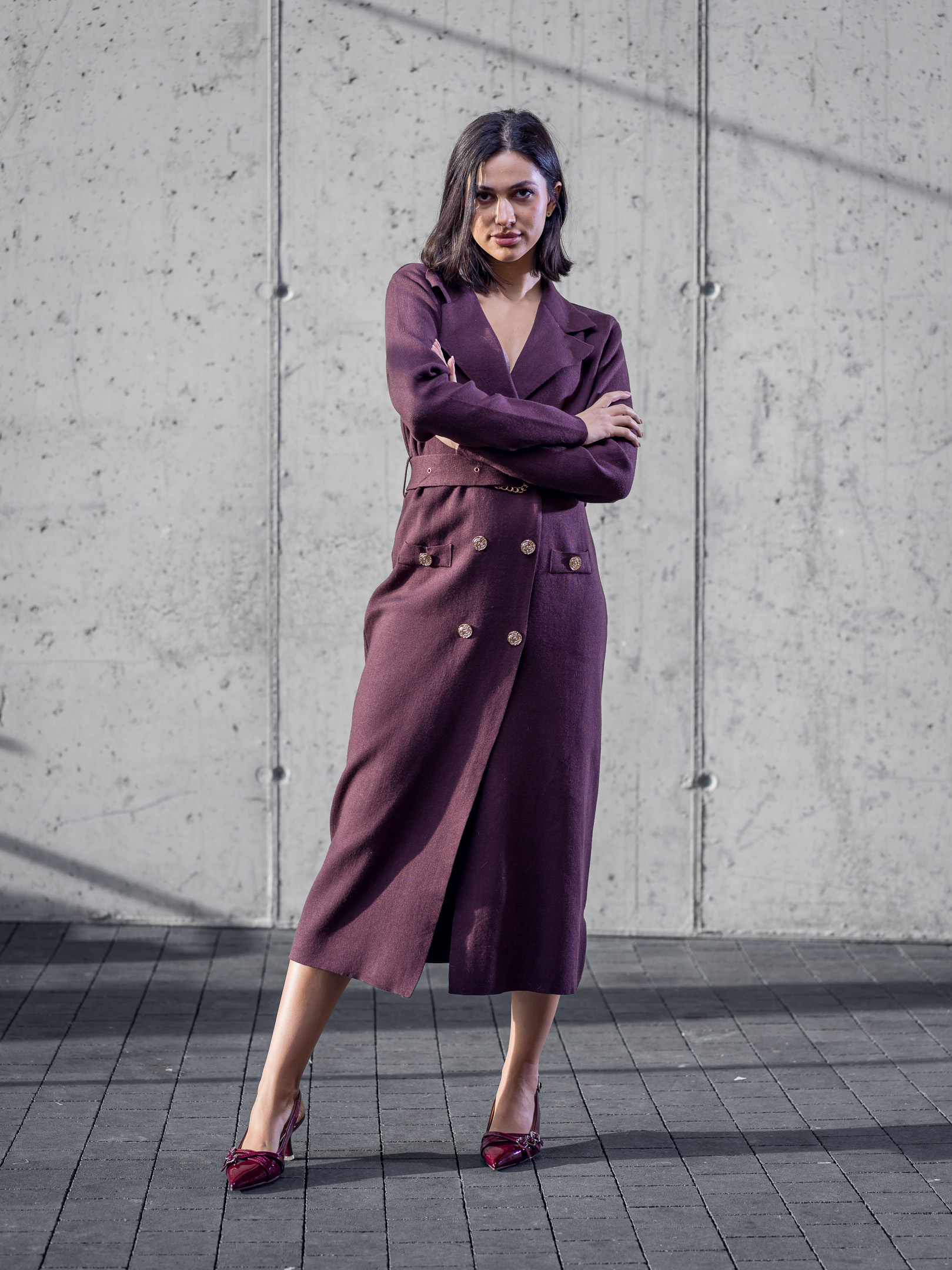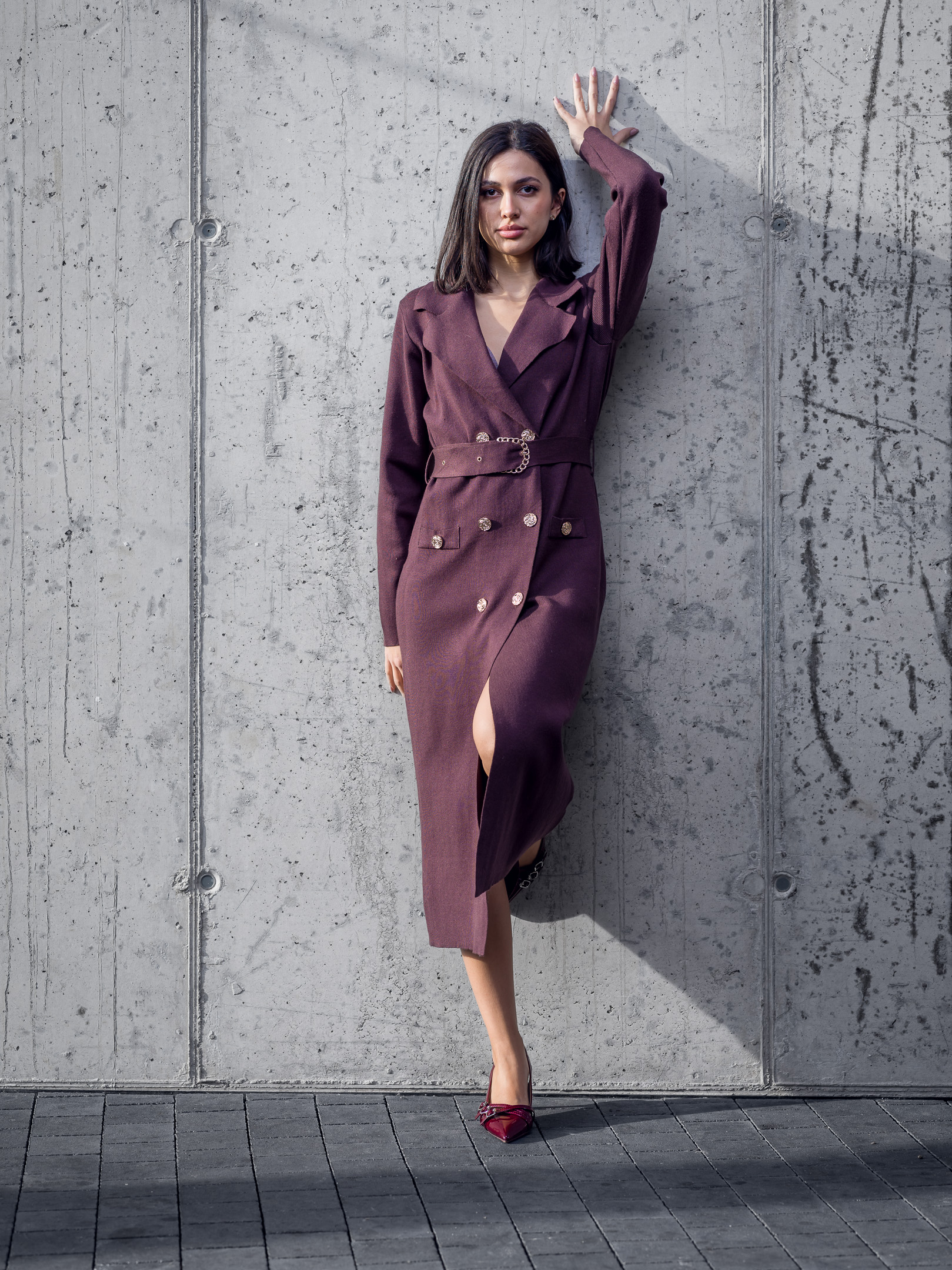 Dlhé úpletové šaty doplnené opaskom z rovnakej látky. Made in Italy.