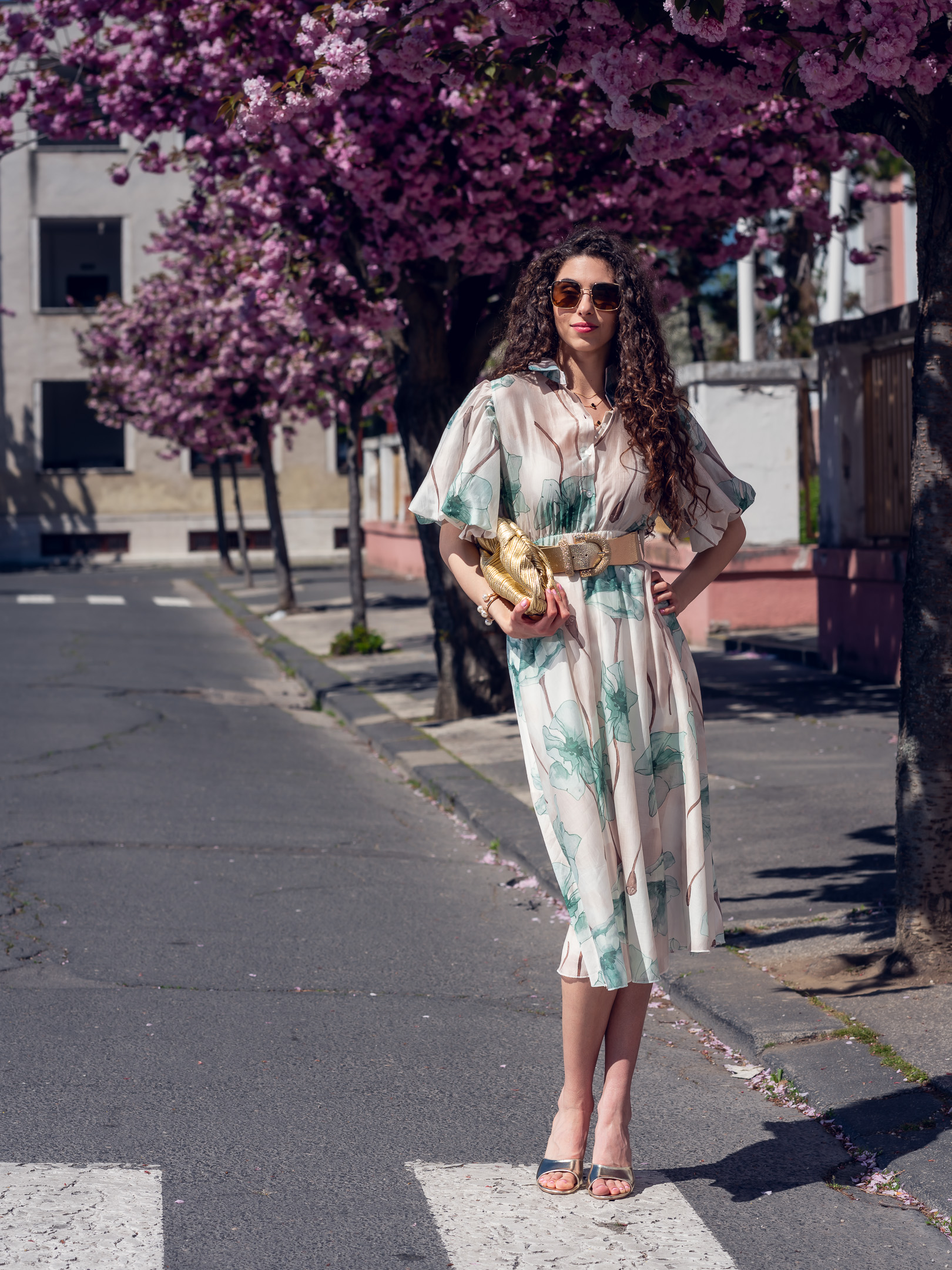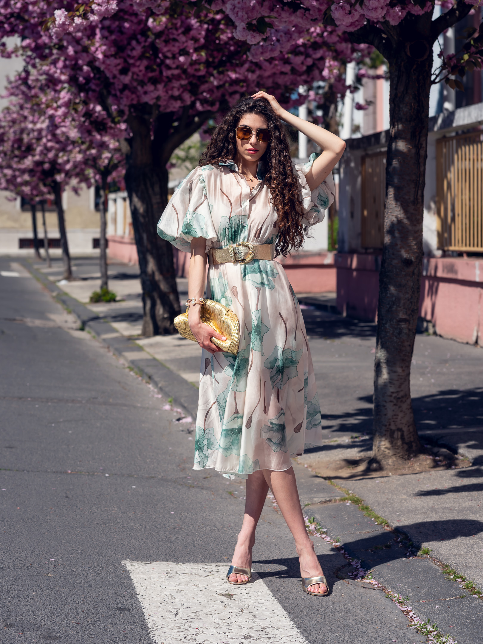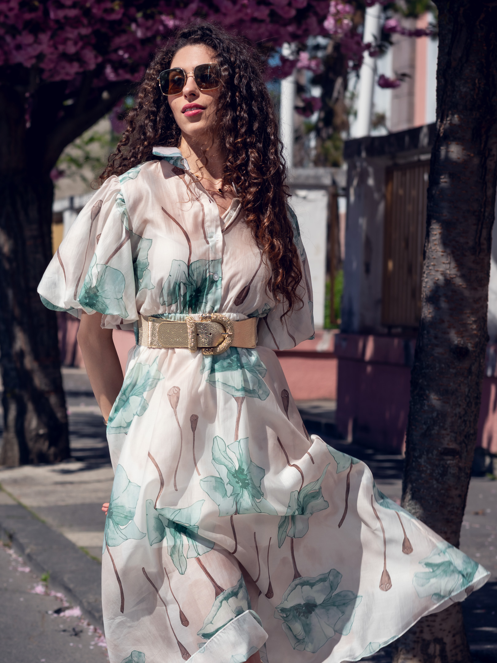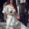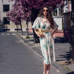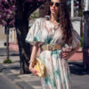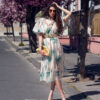 Ľahké padavé šaty s jemným vzorom kvetov. Šaty sú doplnené hnedým opaskom (nie tým na foto).